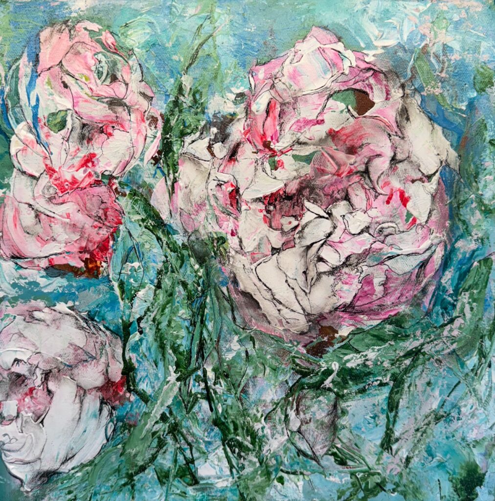 36″ x 60″ (donation)Birthday Peonies 36″ x 36″ (sold)Bloom 40″ x 40″ Lushes 40″ x 40″ (sold)Patio Party 30″ x 48″ (sold)Camilla’s Garden