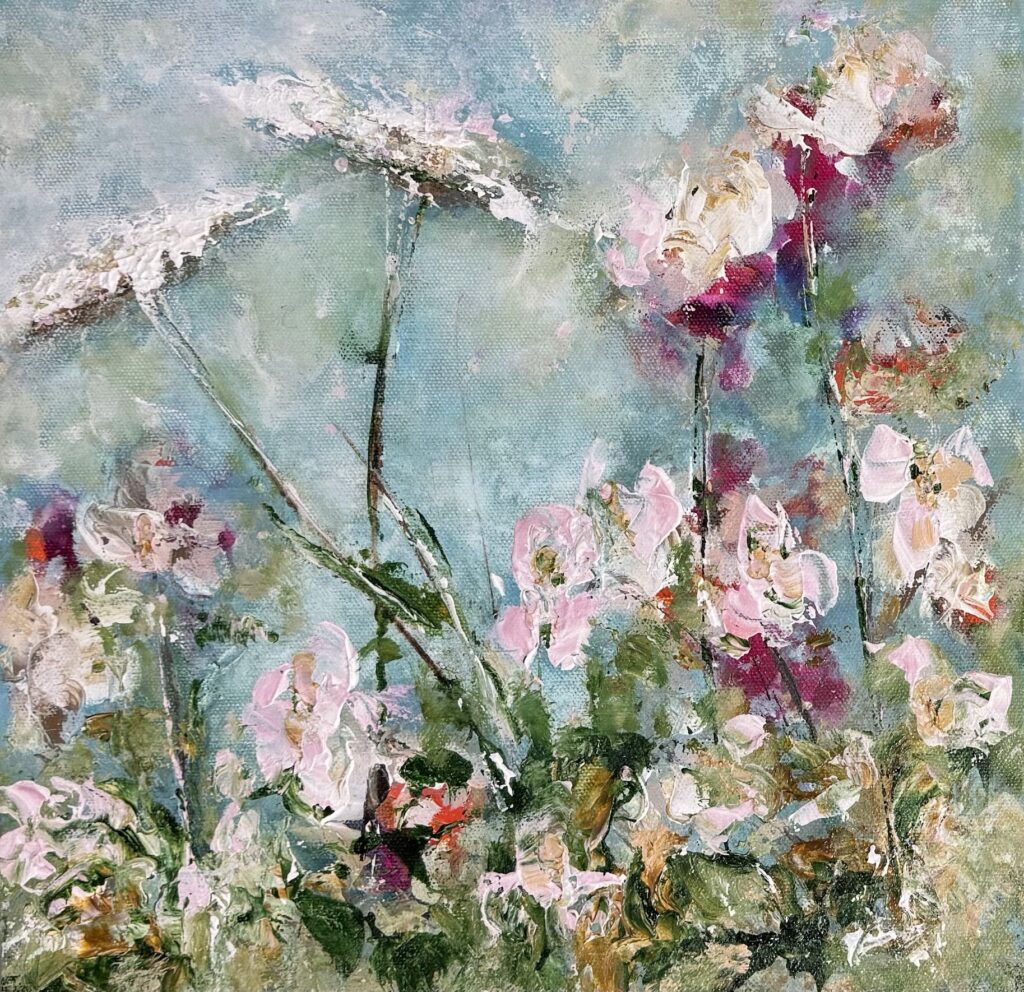 12″ x 16″ (sold)Lush Blossoms 12″ x 16″ (sold)Cascade 60″ x 48″ (sold)Silver and Rose